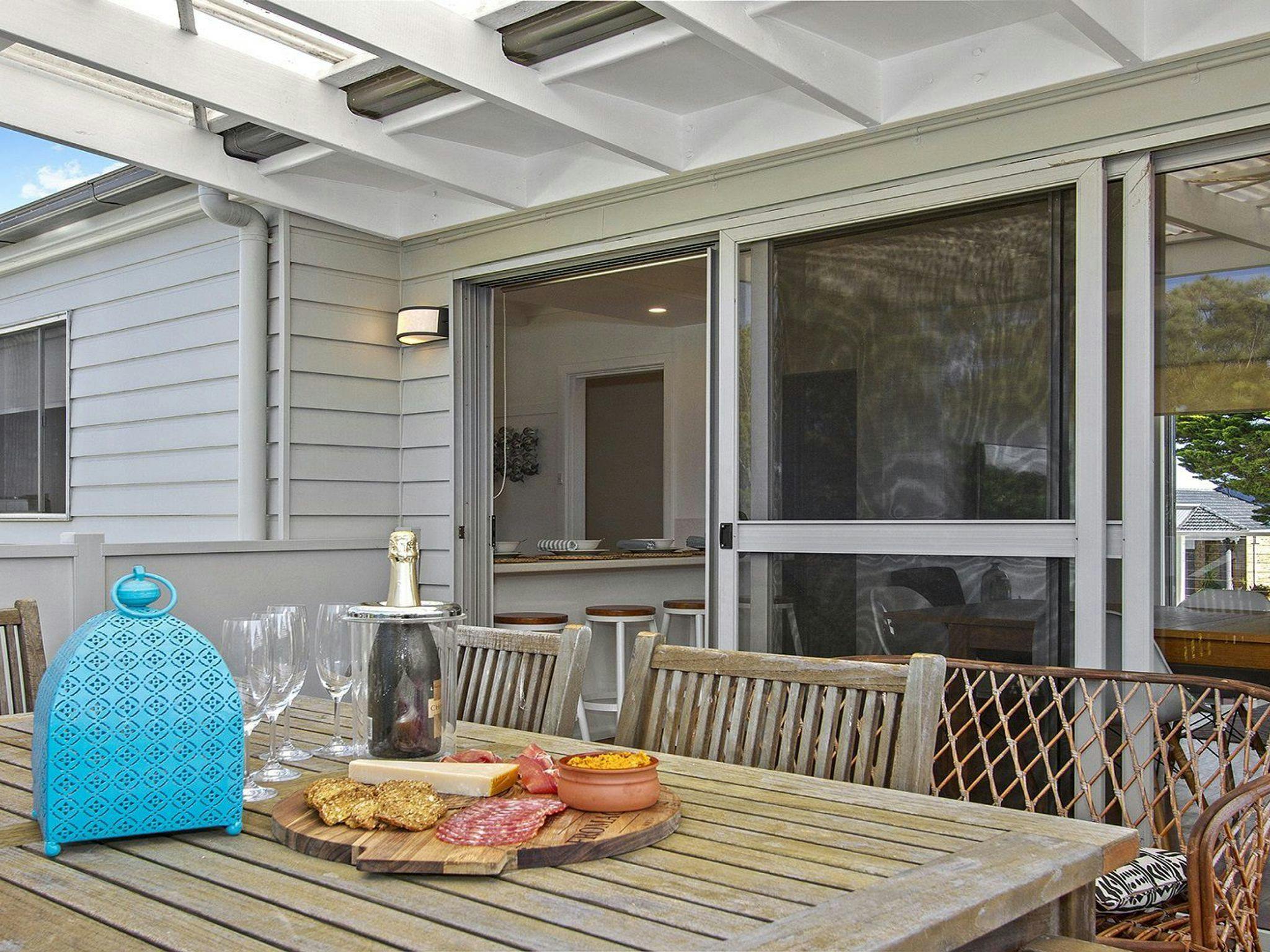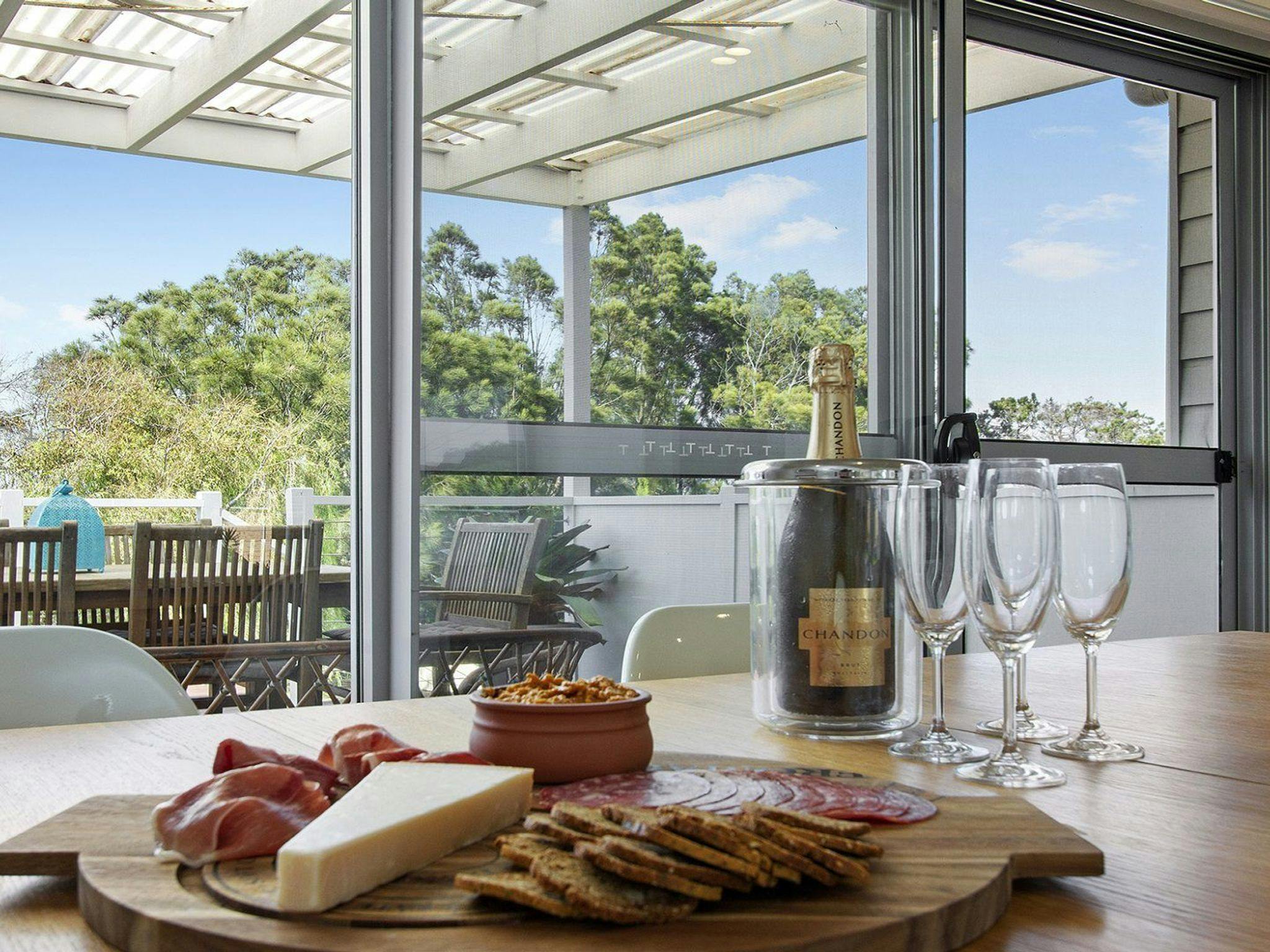 Beaches at Culburra では、モダンなキッチンと朝食バー、ダイニング、リビング ルームを備えたオープン プランのリビングを提供しています。リビングエリアの前後に床から天井までの大きな窓とガラスの引き戸があり、それぞれデッキにつながっています。これらの窓からは一日中太陽の光がたっぷりと差し込み、また通風もできるので、海の空気の匂いや波の音が聞こえます。