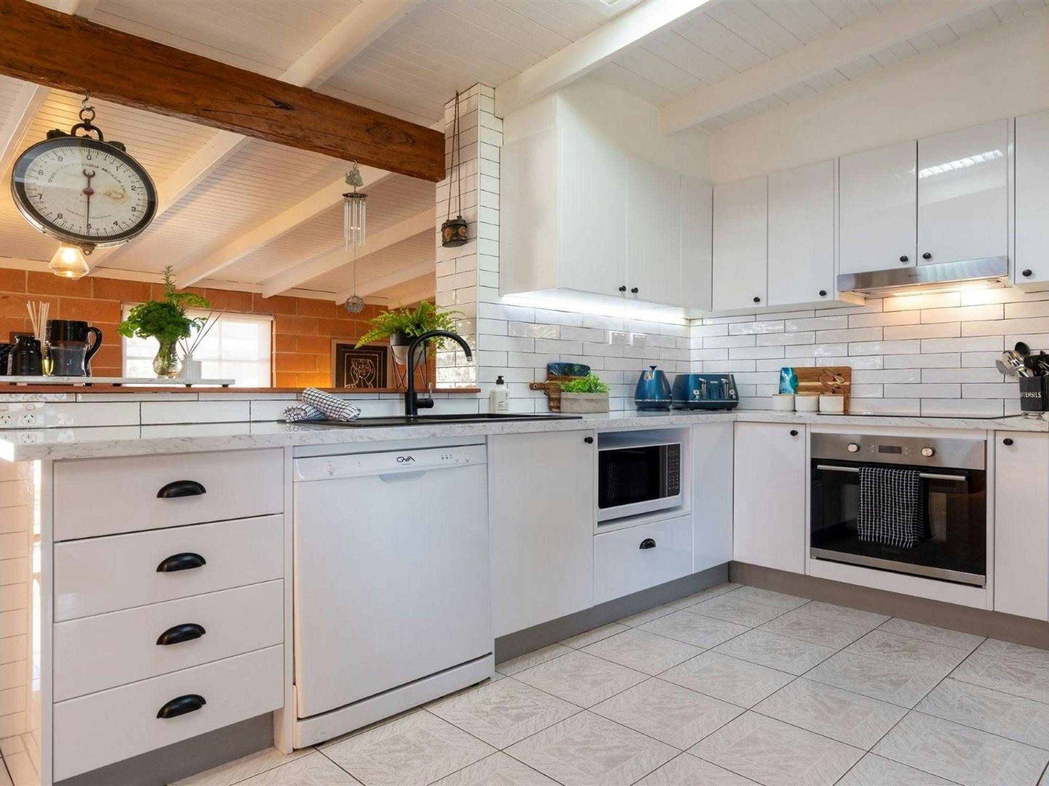 食器洗い機と電子レンジを備えたキッチンがあり、このエリアは別のシッティングエリアとダイニングルームにつながっています。