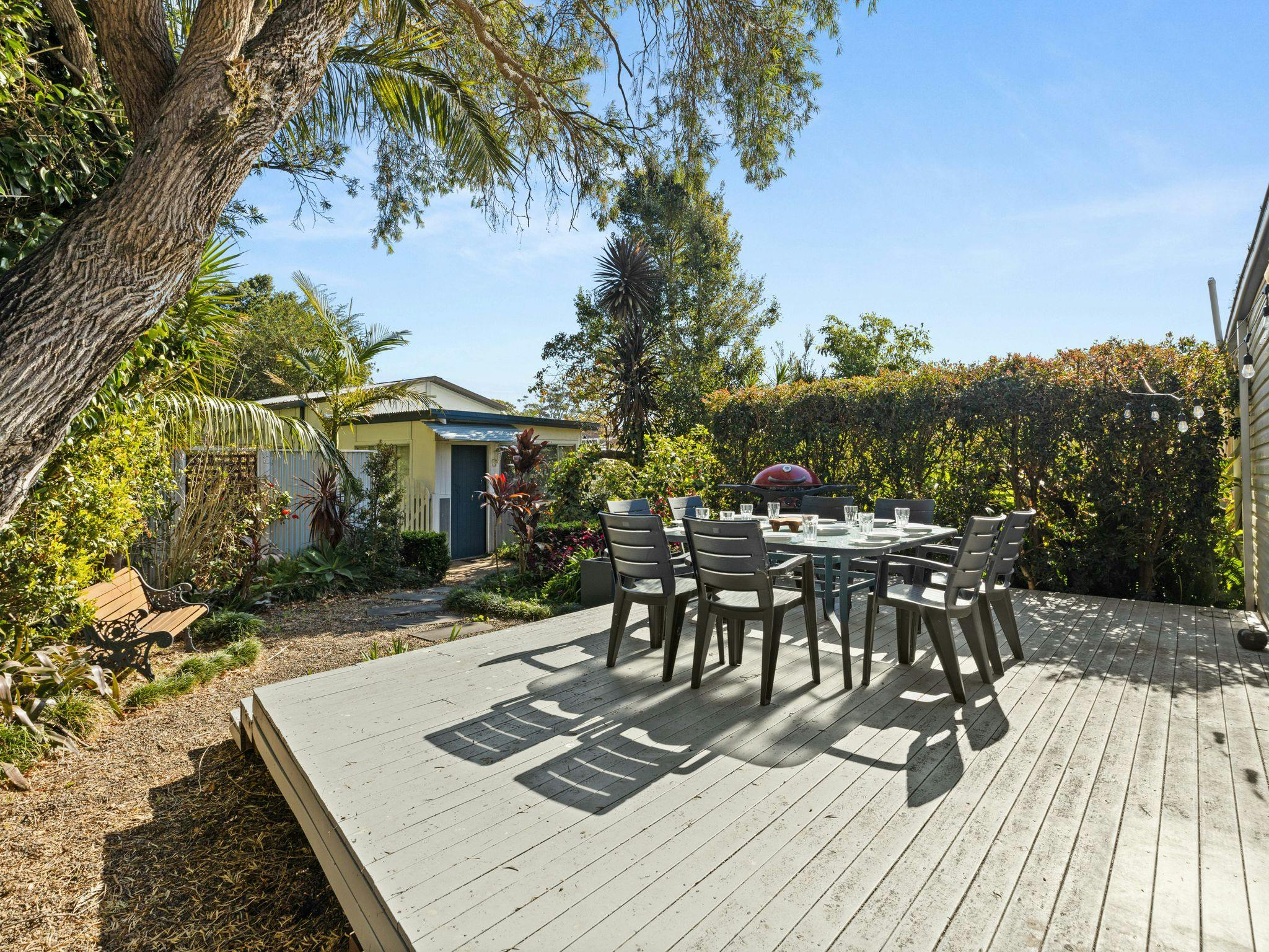 安全なコテージガーデンでは、ダイニングセットを備えた前後のデッキと、屋外での食事に最適なジーグラー&ブラウン製の大型バーベキューグリルがあり、屋外でのお食事をお楽しみいただけます。