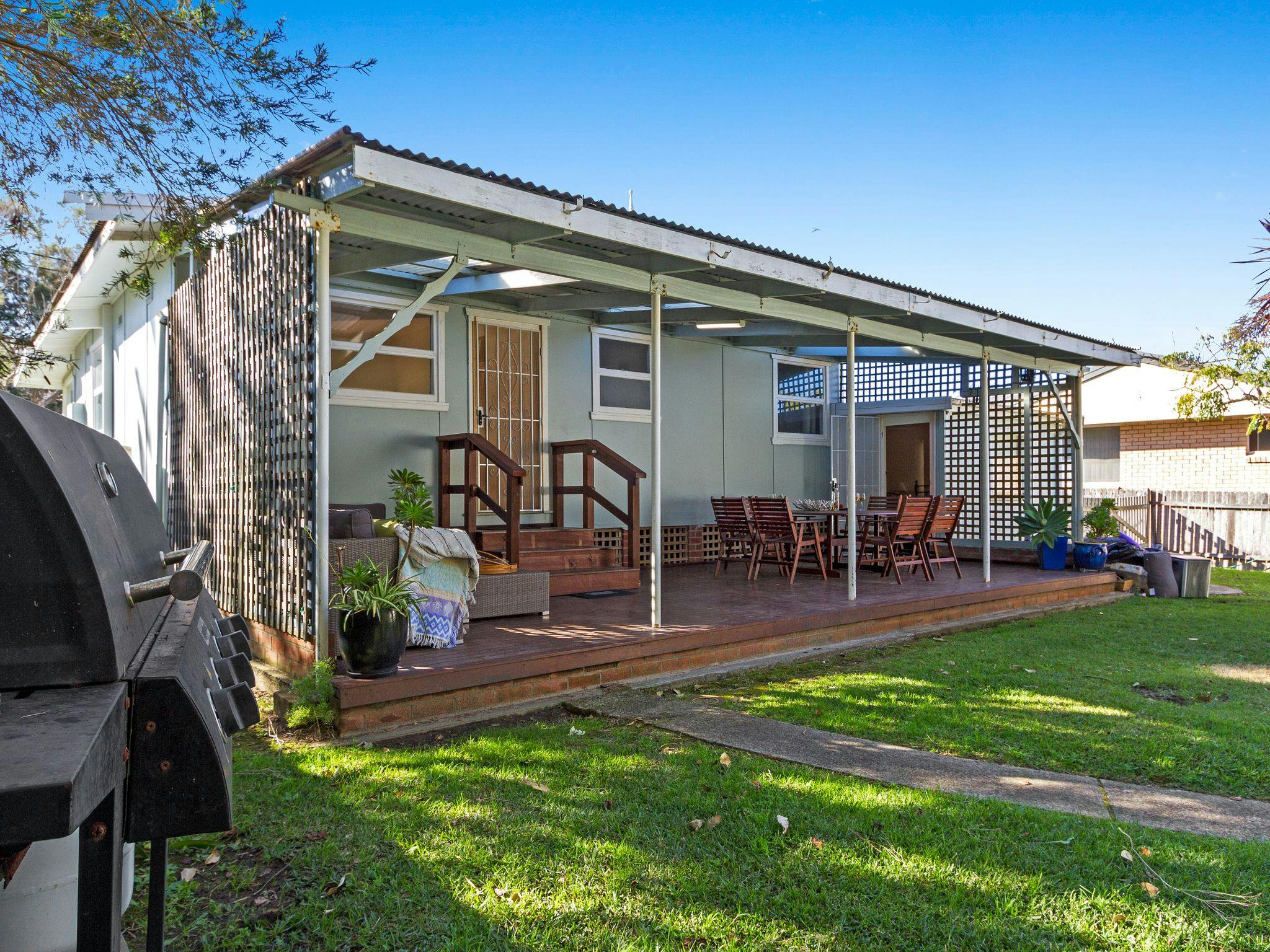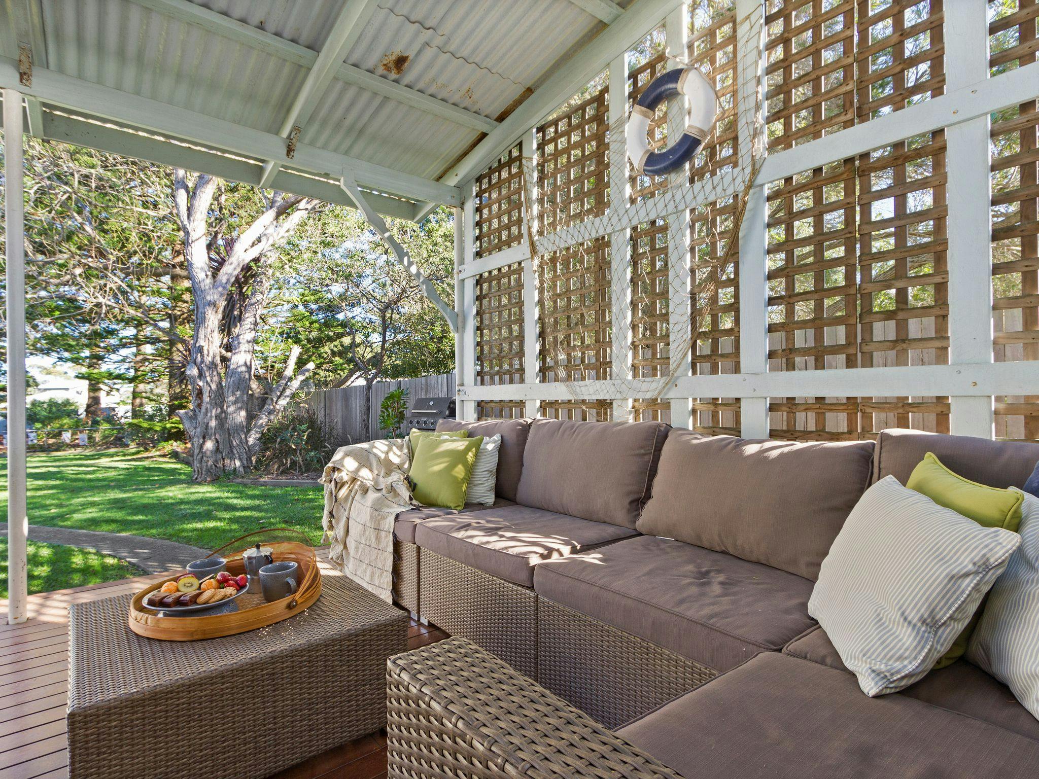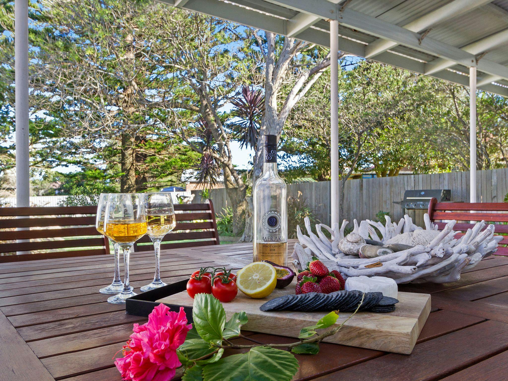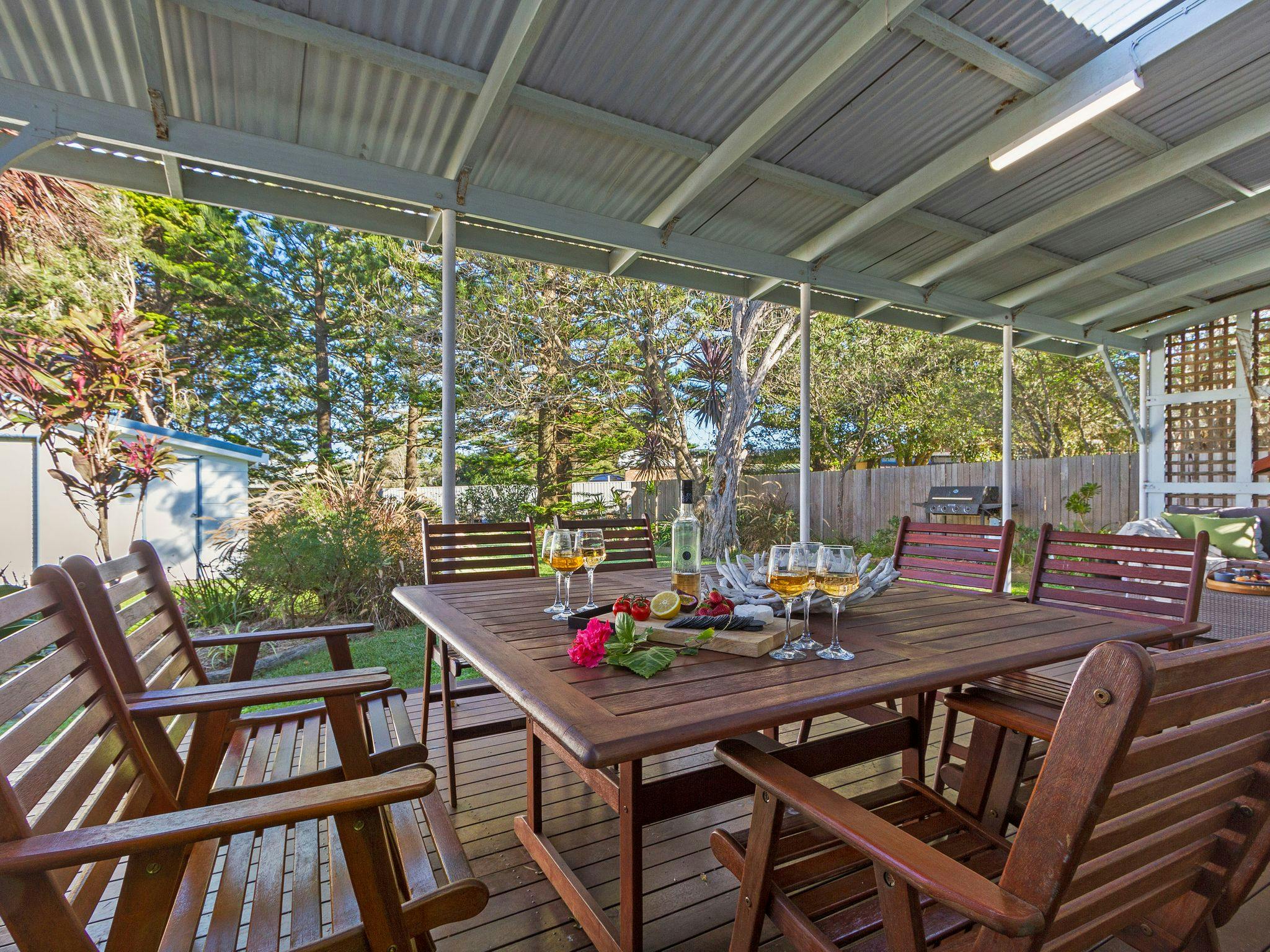 With a largely peaceful and private gated garden, it is ideal for children, pets and adults. This lovely beach house has an open-plan layout and a large undercover timber deck with a gas barbeque overlooking the private back garden making family meals a breeze. The property offers two bedrooms with queen size beds. The Bunkroom has a set of bunks (single) and another queen-size bed and a single bed (please note this is not connected to the main house).