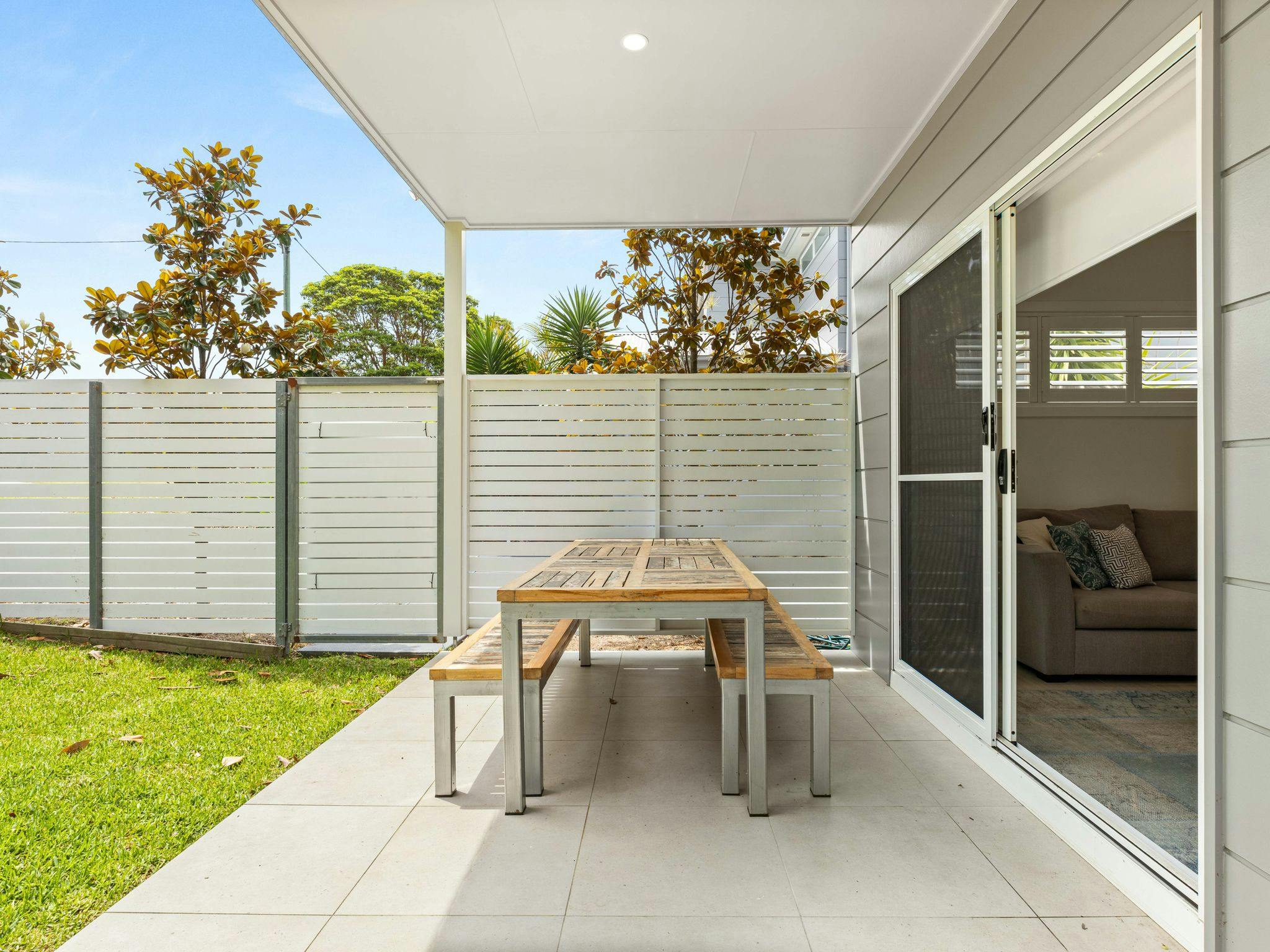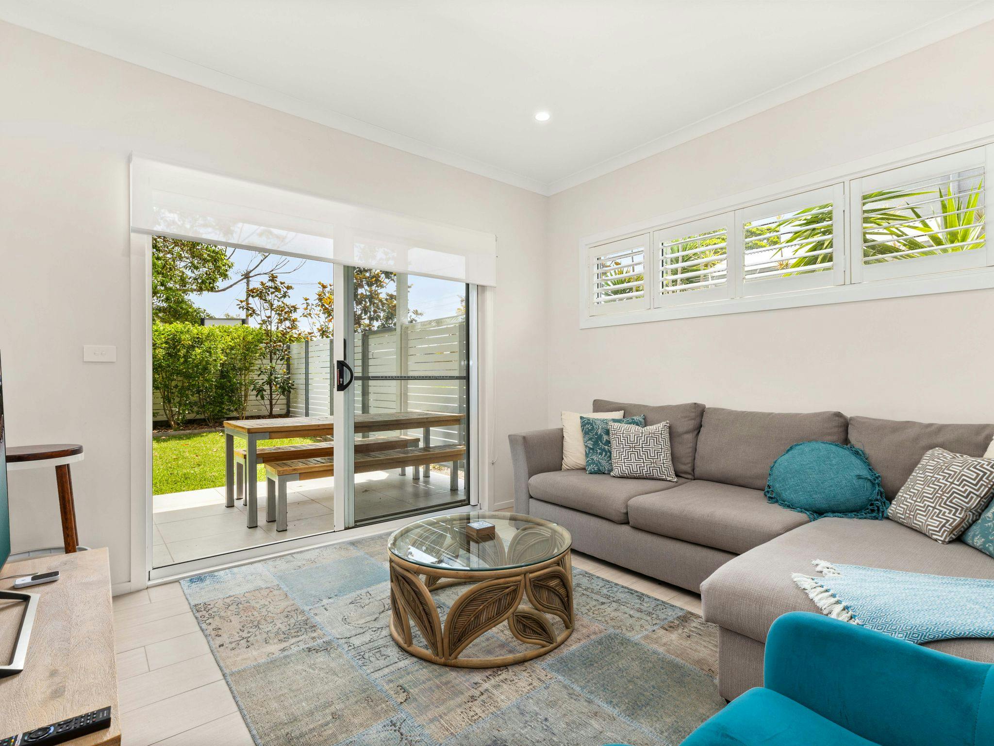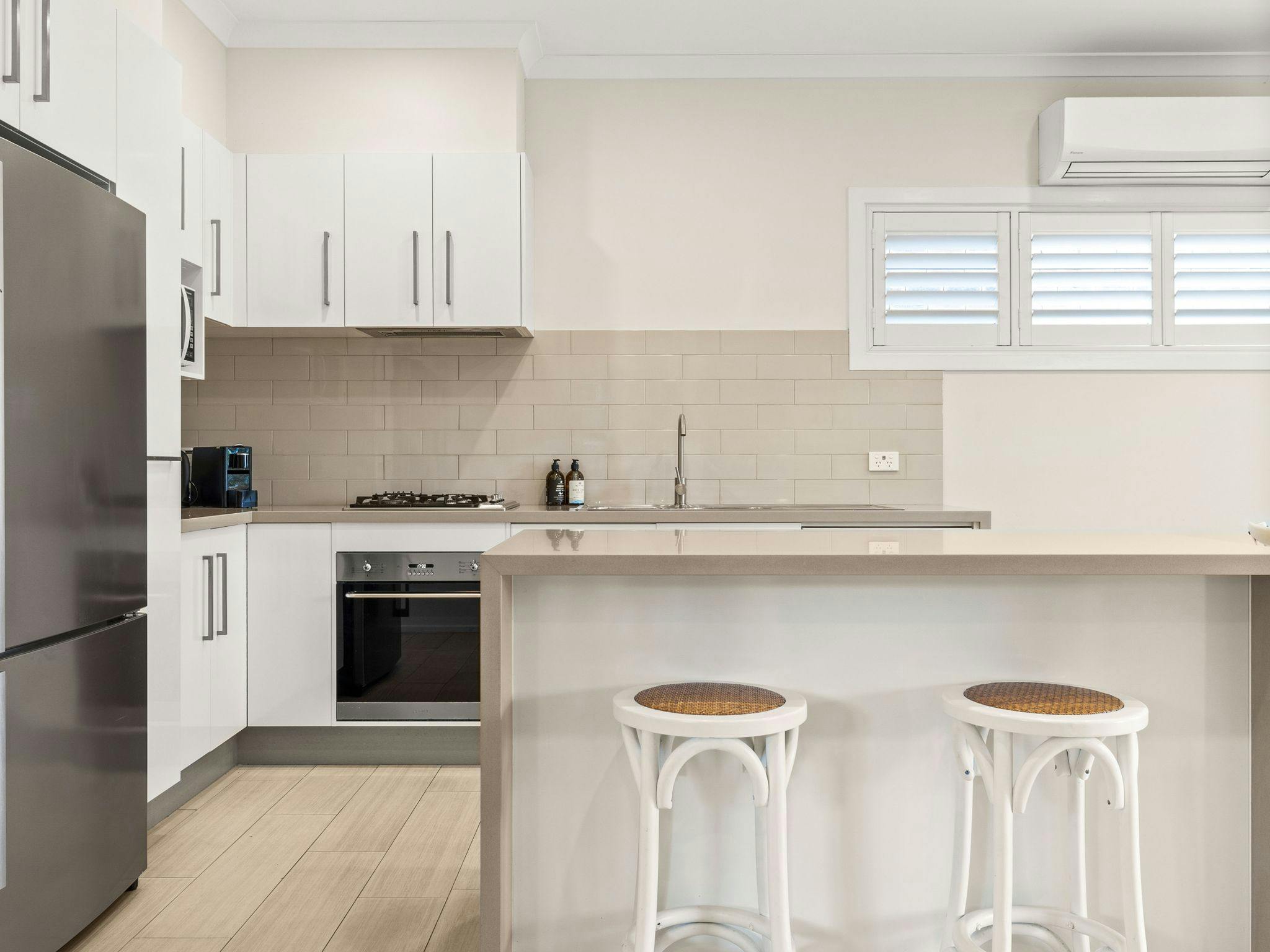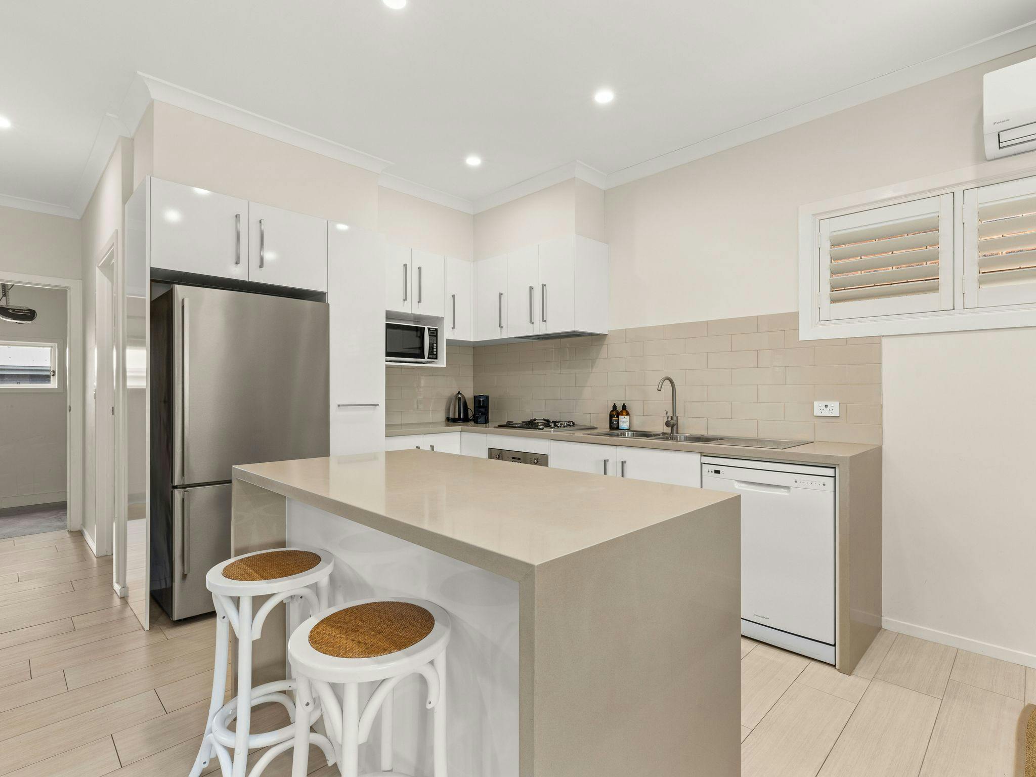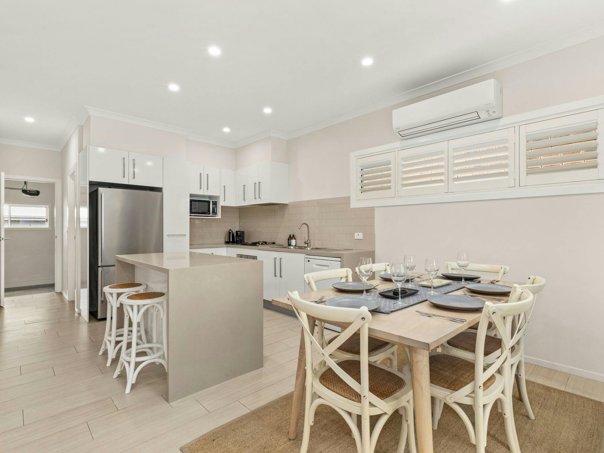 The fully equipped kitchen includes a pod coffee machine, gas cooktop, and essential pantry items. Outside, unwind in the covered entertaining area with a BBQ and dining for eight, or gather around the fire pit (BYO firewood) in the secure yard.