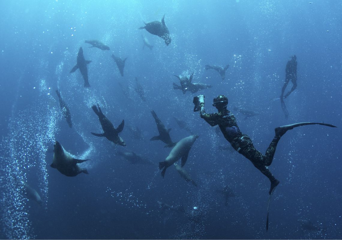 During the cooler months, dive with up to 1,800 fur seals, pods of dolphins and listen out for whale song from migrating humpbacks. Most seals frolic between three to 15 metres of water, making this an accessible experience for divers of all levels. Around 200 to 500 seals stay around for the summer months and in the winter months, look out for humpback whales.