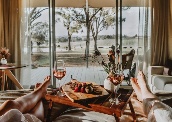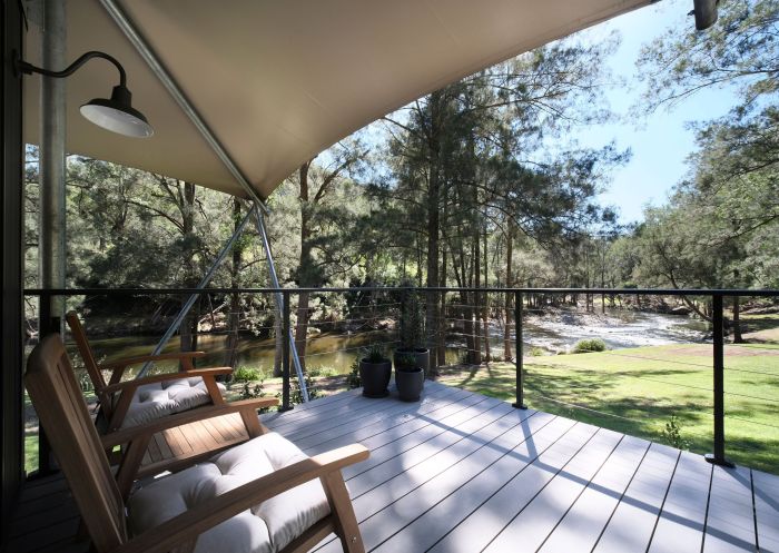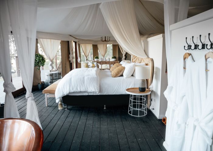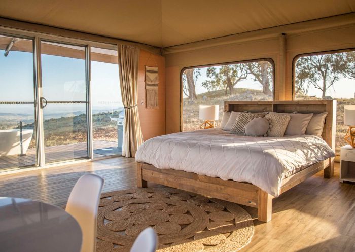Or opt for an eco-tent at Evamor Valley, set on an 80-acre farm property alongside Mudgee's Cudgegong River. While away the hours enjoying a self-guided walk, relaxing by the fire pit, sipping on sunset drinks on your private deck, picnicking on the jetty, or simply cosying up in your plush king bed and taking in the bushland views.