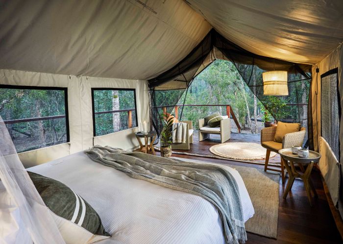Paperbark Camp offers a luxury sustainable glamping experience in a bushland setting in the Shoalhaven region, a 2.5-hour drive south of Sydney. The 12 safari-style canvas tents sit strategically among native eucalypts, have lovely decks and feature hotel-quality linen and amenities. You can canoe, snorkel, cycle or swim in the crystal-blue waters of Jervis Bay, and later head to dinner at on-site treetop restaurant Gunyah, spotting native wildlife along the way with your torch.