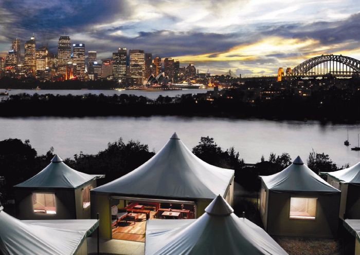 Experience glamping in the middle of Sydney Harbour at Cockatoo Island Waterfront Glamping. You can camp right by the waterfront in pre-furnished tents, with access to toilets, hot showers and a communal kitchen with barbecues, fridges and more.