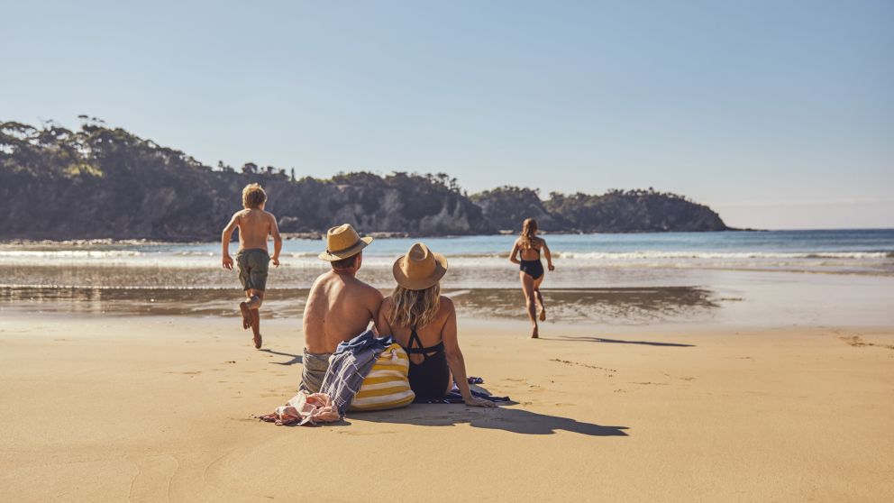 Family enjoying a visit to McKenzies Beach, Malua Bay.